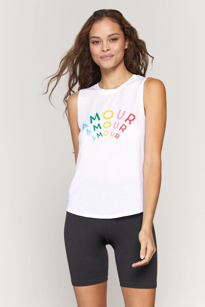 Activate your mind, body, and spirit in our Amour Active Muscle Tank. Made from SG Intention Slub Jersey, this ultra soft and lightweight tank is ideal for all your sweat sessions. This slightly sheen, moisture wicking, and quick drying tank features a rainbow “Amour” front graphic.