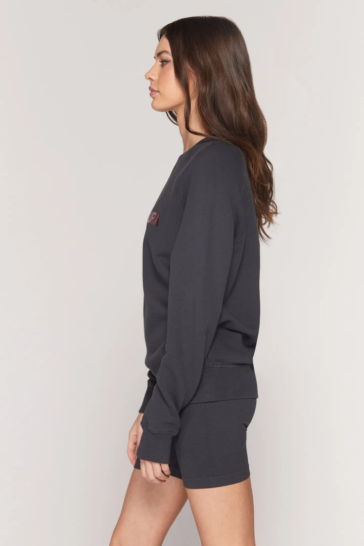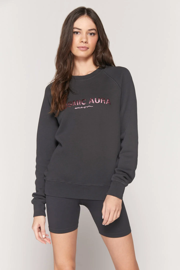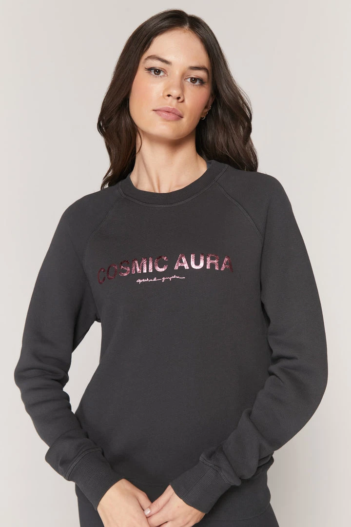 You are the entire universe in one drop in our classic Cosmic Old School Sweatshirt. Our Old School Sweatshirt is back and better than ever, made from super soft 100% Bahia Terry Cotton, a rib crew neck, raglan sleeves, a pink foil “Cosmic Aura” front graphic, and a relaxed fit. Pair with biker shorts of matching sweatpants.
