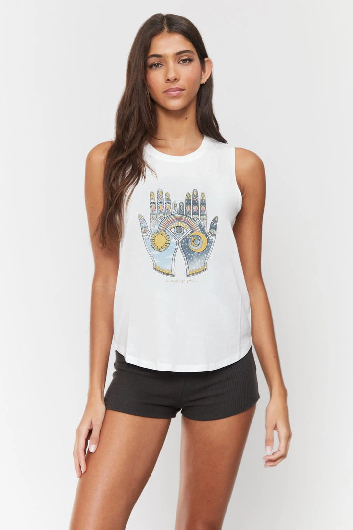 Find balance in the Hands Muscle Tank. Designed for incredible breathability for all your sweat sessions, our Hands Muscle Tank features a slim fit, slightly dropped armholes, a colorful front graphic, and hits at hip length.