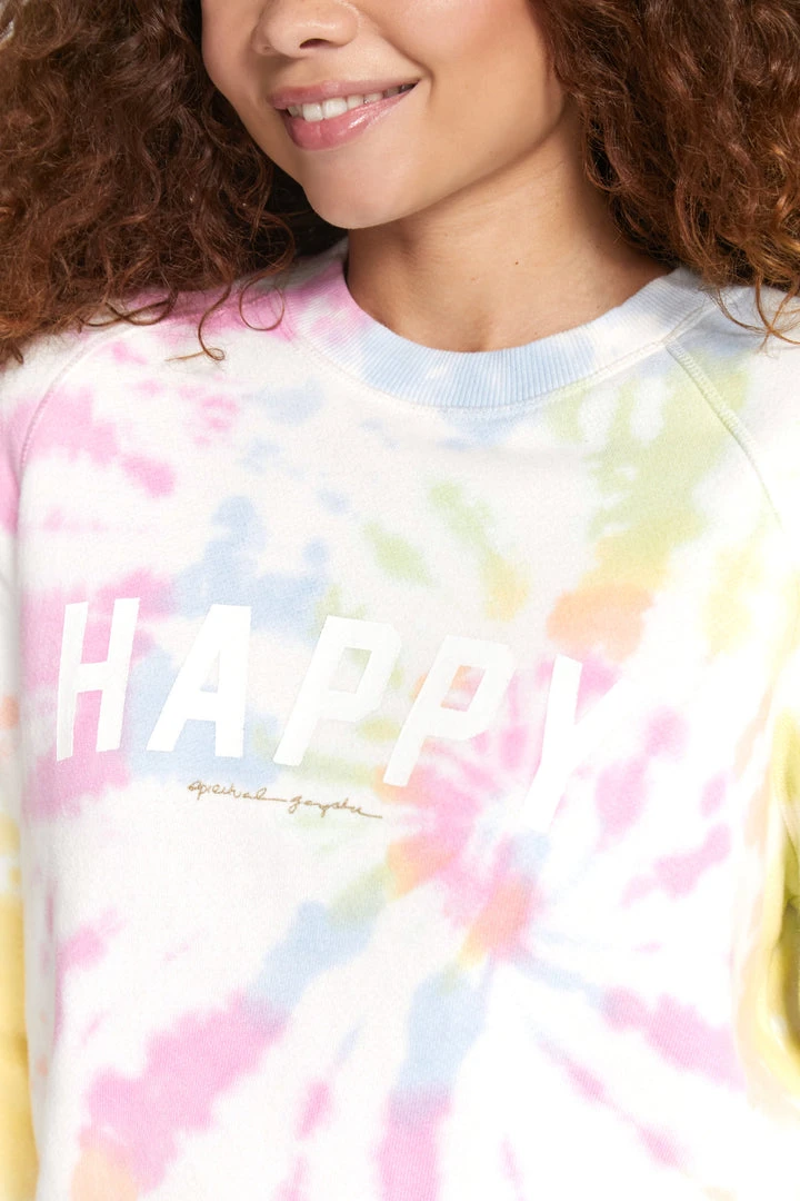 Choose happiness in our bright and beautiful Old School Sweatshirt. Made from a super soft tri-blend loop terry, the Happy Old School Sweatshirt features a rib crew neck, raglan sleeves, a vintage inspired “Happy” front graphic. Created with our hand dyed Sunny Days Swirl Tie Dye and hits at hip.
