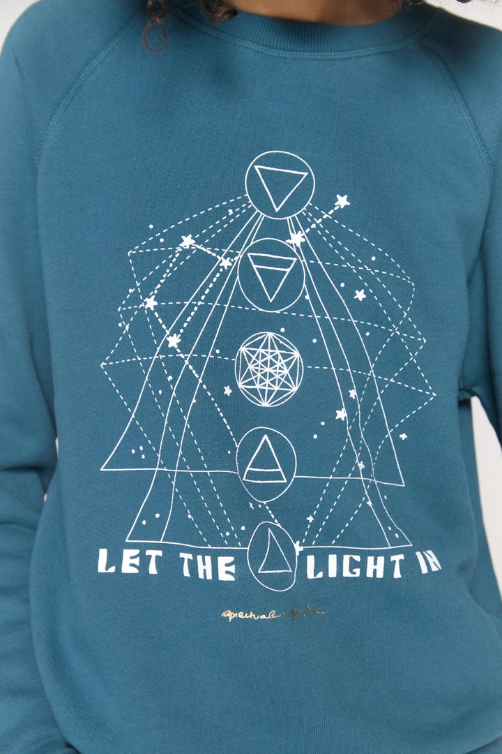 May you be guided by the light in our Light Old School Sweatshirt. Our classic Old School Sweatshirt is back and better than ever, made from super soft 100% Bahia Terry Cotton, a rib crew neck, raglan sleeves, a sacred geometry inspired “Let the light in” front graphic, and a relaxed fit.