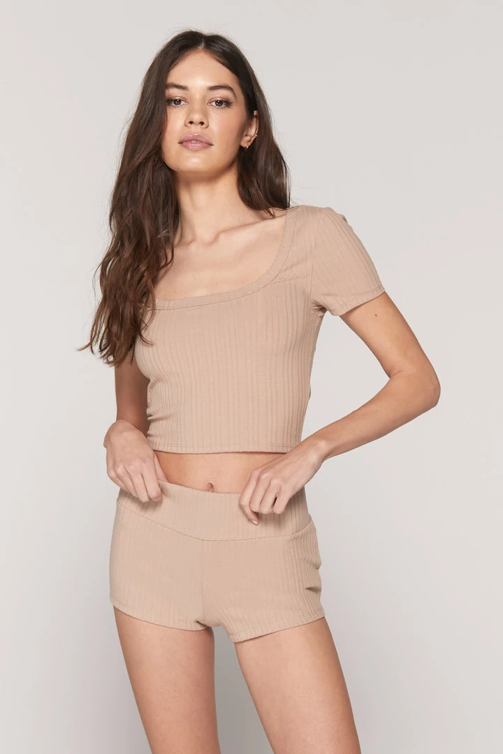 Soft and effortless, our everyday essential Sedona Rib Tee is formfitting with a scoop neck, crop fitted short sleeves, and hits at the small of the waist for a flattering cropped silhouette. Made from our super soft rib spandex blend, the Sedona Rib Tee is perfect for looking cute while lounging, and pairs with our Sedona Rib Shorts or Laguna Sweatpants.