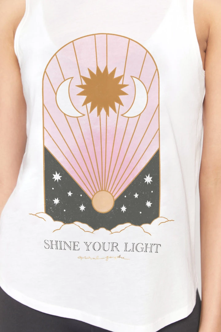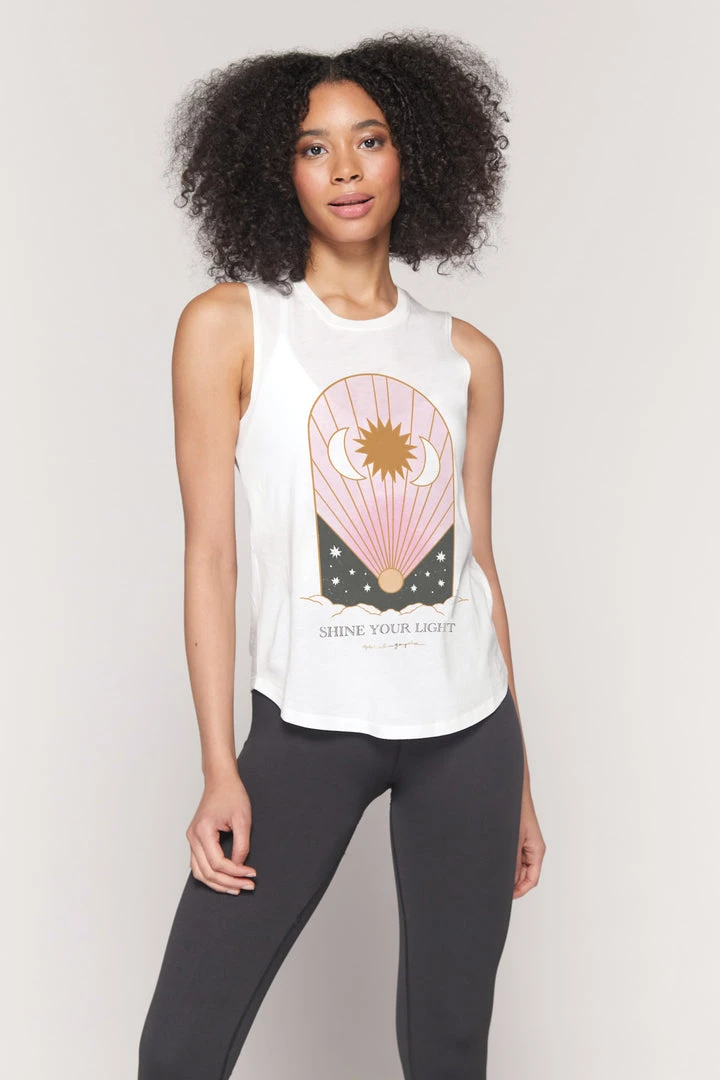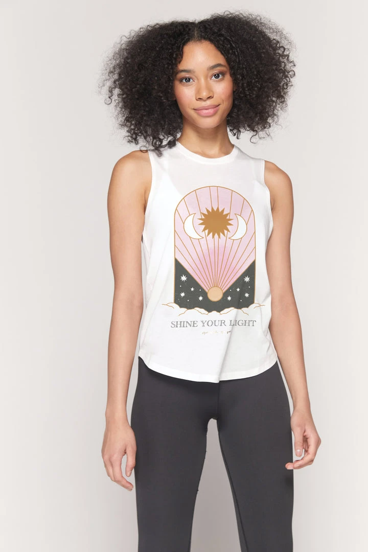 The world needs you to shine your brightest lighting our best-selling Muscle Tank. Featuring a relaxed slim fit, shaped hem, crew neck, and designed for incredible breathability for all your sweat sessions. A tarot-inspired front graphic with “Shine your light” mantra adorns the front of this tank. Pair with joggers or biker shorts.