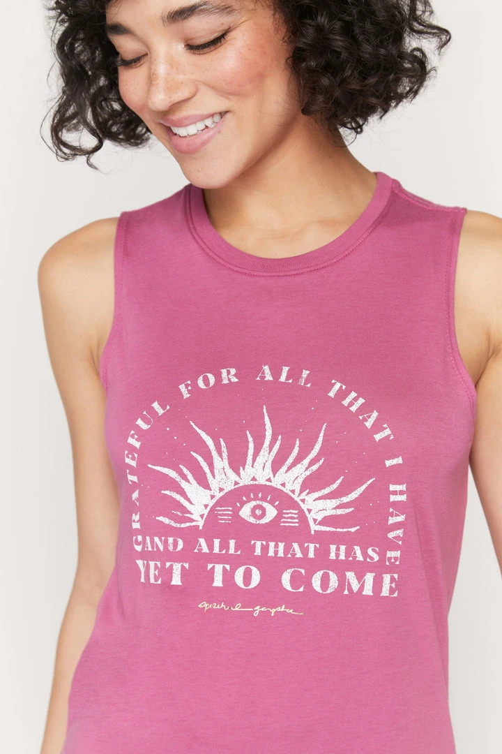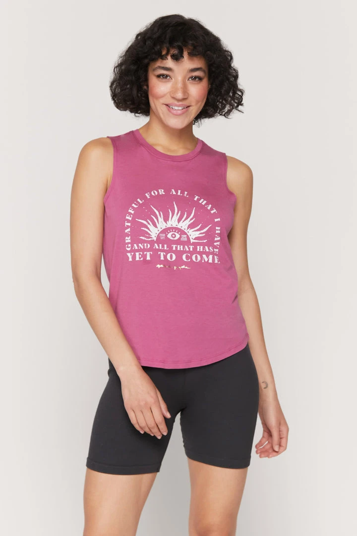 A grateful heart is a magnet for miracles in our best-selling Muscle Tank. Designed for incredible breathability for all your sweat sessions, our Grateful Muscle Tank features a slim fit, slightly dropped armholes, a vintage tarot card inspired front graphic reading “Grateful for all that I have and all that is yet to come” in a stunning vibrant hue.
