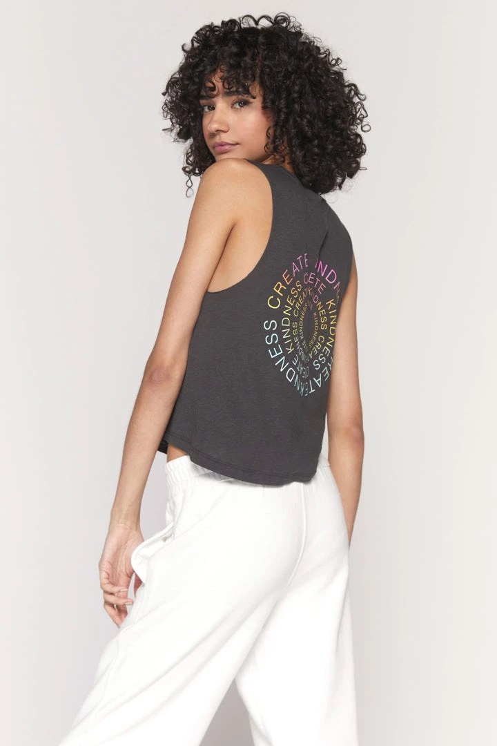 Create Kindness in our Classic Crop Tank. Our Kindness Crop Tank features a crew neck, raw, slightly dropped armholes, a rainbow “Create Kindness” back graphic, and is made from our ultra soft tri-blend jersey fabric. Perfect for finding your flow on and off your mat, pair the Crop Tank with biker shorts or your favorite sweats.
