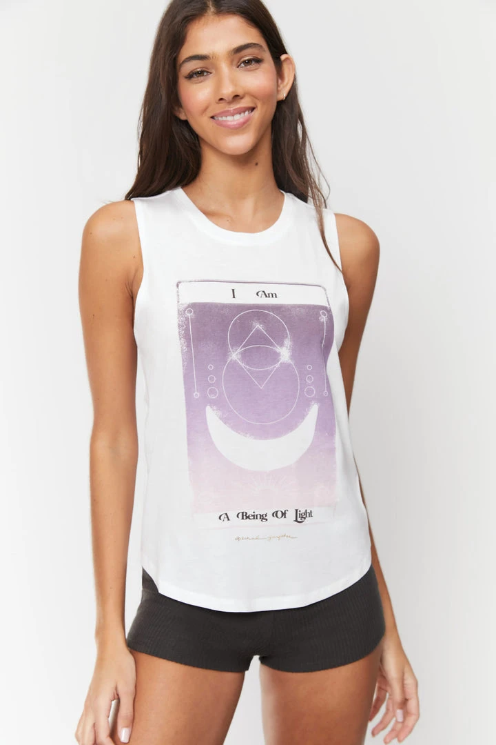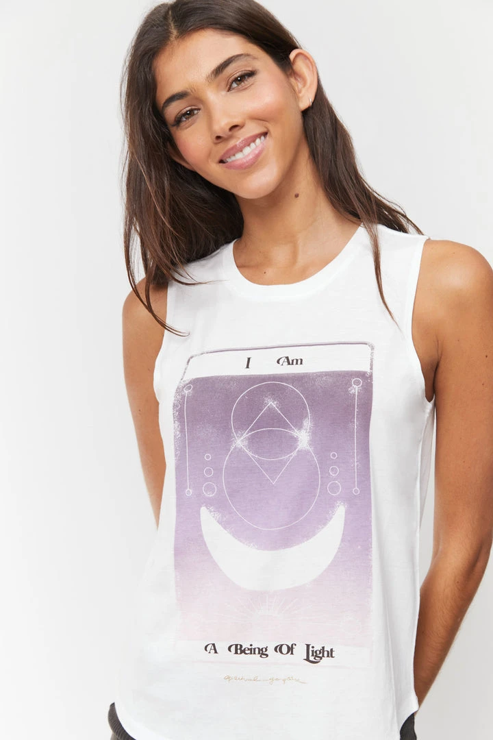 Let your light radiate in our tried-and-true Muscle Tank, updated with a new graphic for the season. In super soft cotton modal blend jersey, it’s designed with an easy straight fit and slightly dropped armholes for added breathability, and features a flattering shaped hem. Perfect for running trails to running errands, it’s no wonder that this one has become a cult fave.